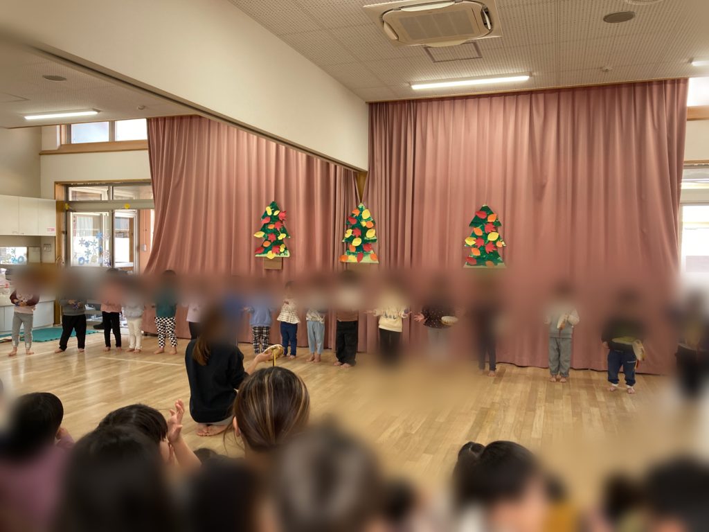 12月に乳児の発表会があるので、ひよこ組とりす組はみんなの前で歌いました