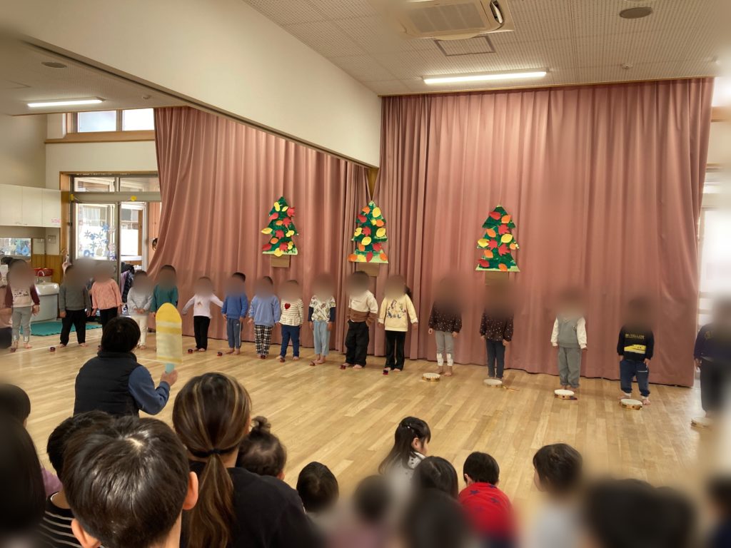 ひよこ組とりす組はジングルベルに合わせて手作りの楽器を持って鳴らしていました